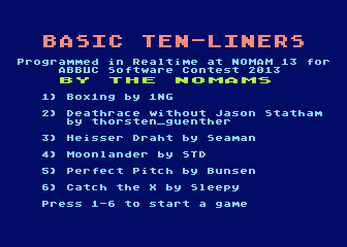 NOMAM BASIC TENLINER CONTEST 2013 LIVE CODING CONTEST THE RESULTS 1 MOONLANDER STD 2 HEIßER DRAHT SEAMAN 3 BOX1NG 1NG 4 PERFECT PITCH BUNSEN 5 CATCH THE X SLEEPY 6 DEATH RACE THORSTEN_GUENTHER