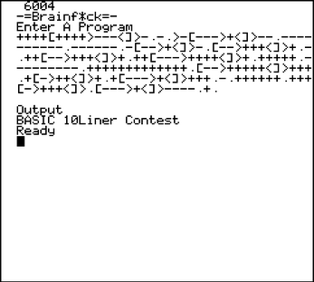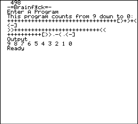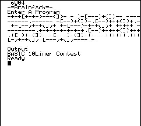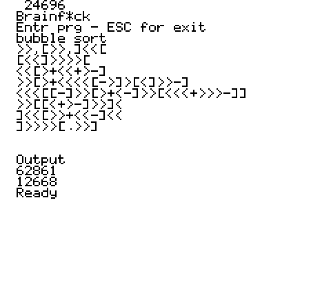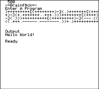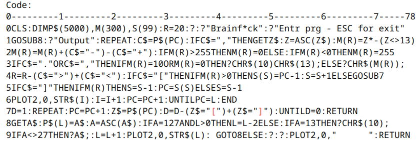 0CLS:DIMM(300),S(99),P$(9000):R=20:?:?"Brainf*ck":?"Entr prg - ESC for exit"