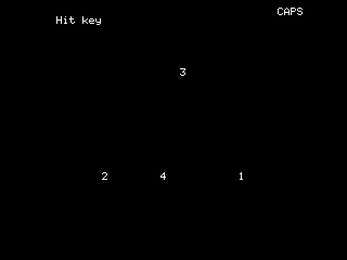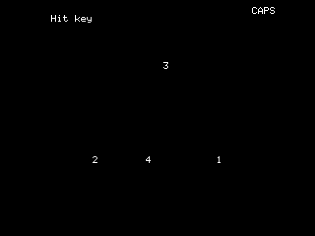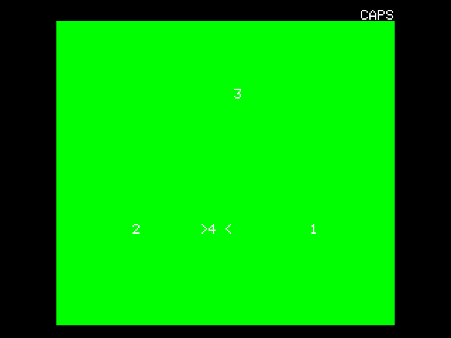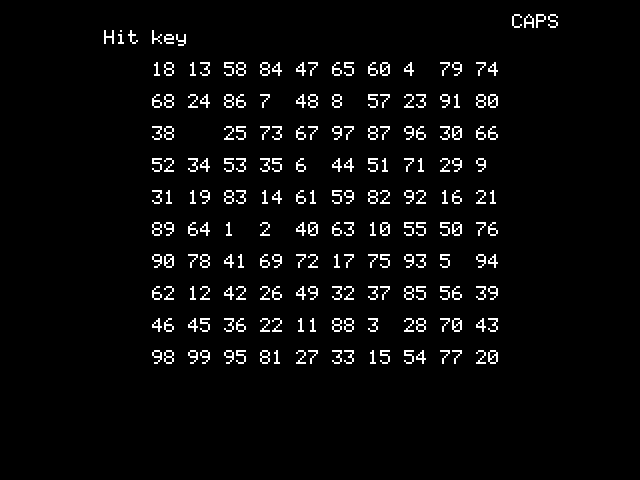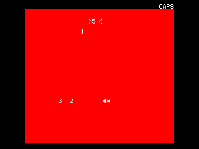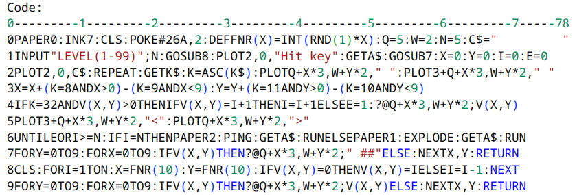 0---------1---------2---------3---------4---------5---------6---------7-----78 0PAPER0:INK7:CLS:POKE#26A,2:DEFFNR(X)=INT(RND(1)*X):Q=5:W=2:N=5:C$=" " 1INPUT"LEVEL(1-99)";N:GOSUB8:PLOT2,0,"Hit key":GETA$:GOSUB7:X=0:Y=0:I=0:E=0 2PLOT2,0,C$:REPEAT:GETK$:K=ASC(K$):PLOTQ+X*3,W+Y*2," ":PLOT3+Q+X*3,W+Y*2," " 3X=X+(K=8ANDX>0)-(K=9ANDX<9):Y=Y+(K=11ANDY>0)-(K=10ANDY<9) 4IFK=32ANDV(X,Y)>0THENIFV(X,Y)=I+1THENI=I+1ELSEE=1:?@Q+X*3,W+Y*2;V(X,Y) 5PLOT3+Q+X*3,W+Y*2,"<":PLOTQ+X*3,W+Y*2,">" 6UNTILEORI>=N:IFI=NTHENPAPER2:PING:GETA$:RUNELSEPAPER1:EXPLODE:GETA$:RUN 7FORY=0TO9:FORX=0TO9:IFV(X,Y)THEN?@Q+X*3,W+Y*2;" ##"ELSE:NEXTX,Y:RETURN 8CLS:FORI=1TON:X=FNR(10):Y=FNR(10):IFV(X,Y)=0THENV(X,Y)=IELSEI=I-1:NEXT 9FORY=0TO9:FORX=0TO9:IFV(X,Y)THEN?@Q+X*3,W+Y*2;V(X,Y)ELSE:NEXTX,Y:RETURN
