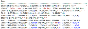 1INPUT"LEVEL(1-99)";N:GOSUB8:PLOT2,0,"Hit key":GETA$:GOSUB7:X=0:Y=0:I=0:E=0