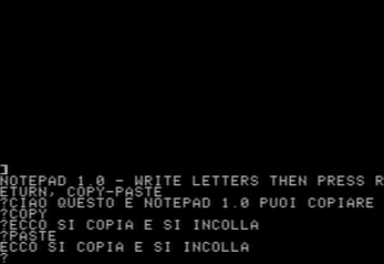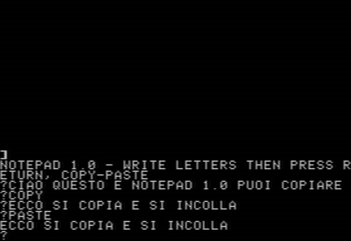 10 ? "NOTEPAD 1.0 - WRITE LETTERS THEN PRESS RETURN, COPY-PASTE" : INPUT B$ 20 IF B$ = "COPY" THEN INPUT D$ 30 INPUT K$ 40 IF K$ = "PASTE" THEN ? D$ 50 IF K$ = "COPY" THEN INPUT Z$ : INPUT R$ 60 IF R$ = "PASTE" THEN PRINT Z$ 70 IF R$ = "COPY" THEN INPUT Y$ : INPUT N$ 80 IF N$ = "PASTE" THEN ? Y$ 90 INPUT M$ 100 IF M$ = "R" THEN GOTO 10