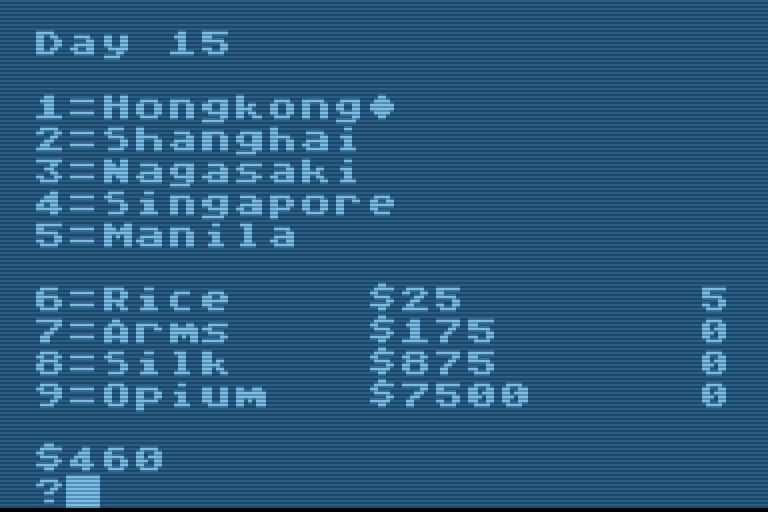 This is a minimal version of Taipan, a 1979 game for 8 bits, based on the book by the same name.