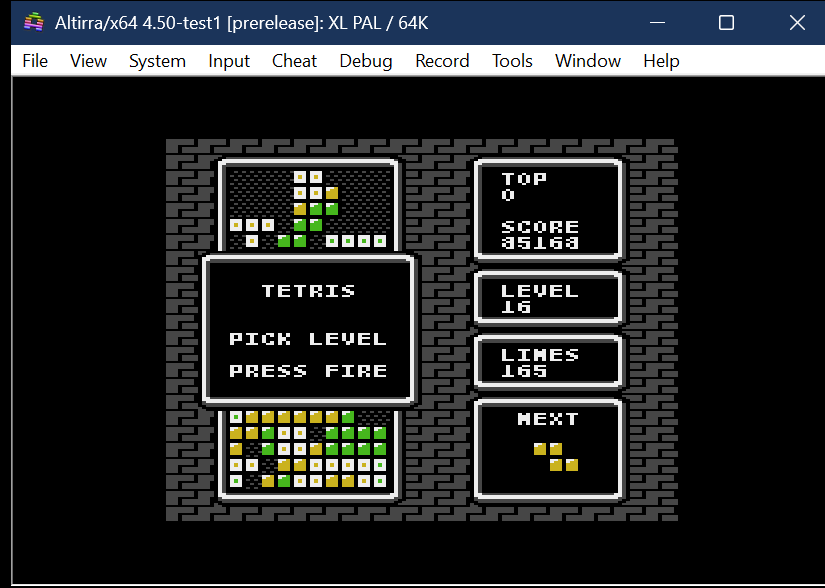 To celebrate this feat, I present this NES Tetris inspired game for the Atari. It uses no player missile graphics or DLI. Just a custom character set. I enhanced my music code to play patterns, to allow for a longer song before it repeats.