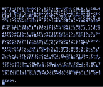 0: Reads the directions datas A(I), B(I), (the actual datas on the end of 3rd and 6th lines) set the colors, and graphic mode, set some variables: T(directions: 1-4,5-8), U(directions set of square playfields), C(„speed”), L(Level), W(wide of the square fields)