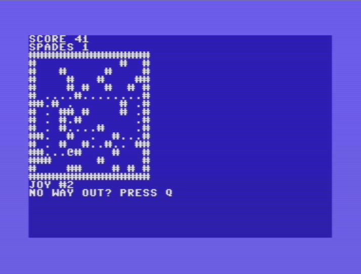 Line 0: W=joy2 port;E=screen address; X,Y,I,K Zezito coordinates; spades= 3; T=ZP address to poke when not poking to the screen; O= space character code; Z1= mask to check joystick idle or not; S$= string to plot the top and bottom of the border around the play area.