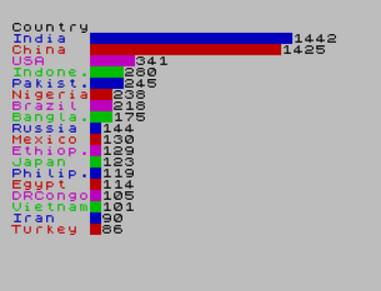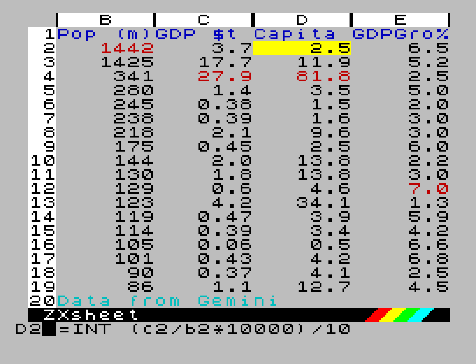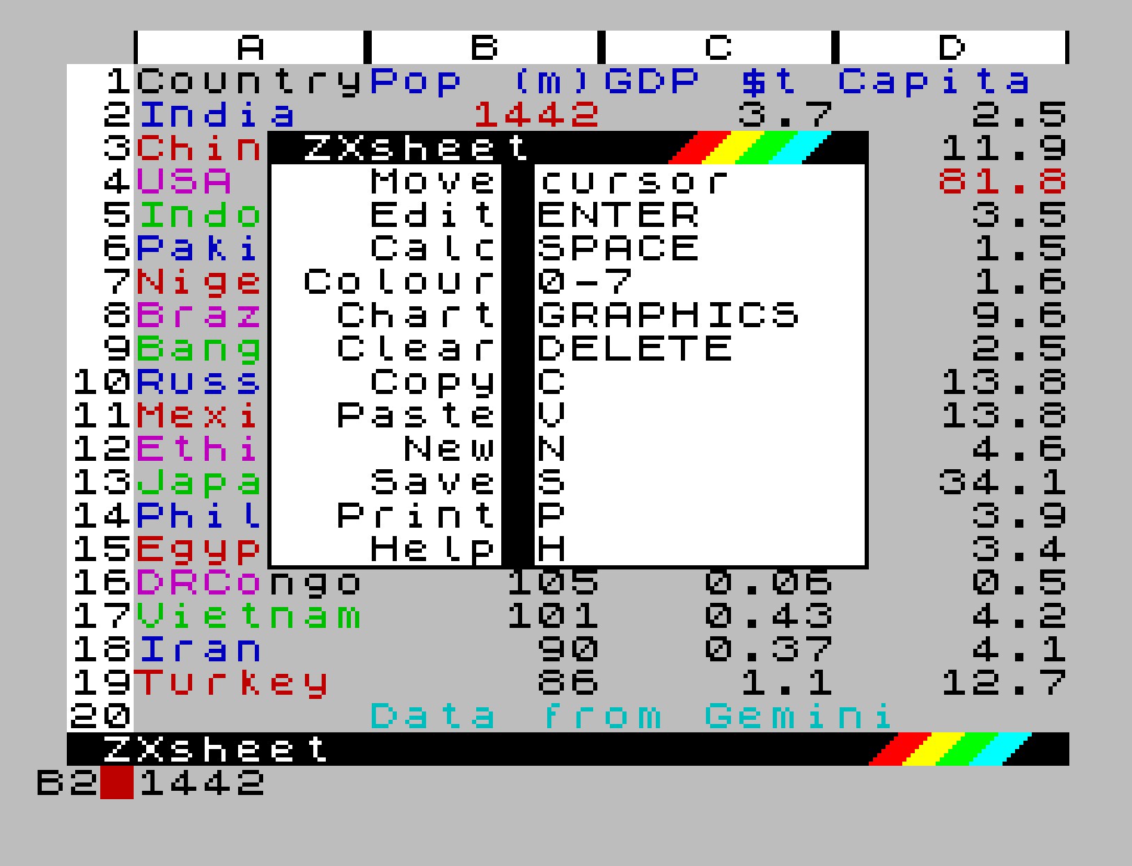 ZXsheet contains a simple bar chart function for visualising your data graphically. For this to work, the first column A must contain your data labels. You can use the 0-7 keys to colour these labels. Then another column should have the data in it. Make sure you have navigated to the HIGHEST value in that column (to correctly set the scale of the bar chart) before pressing the key below: