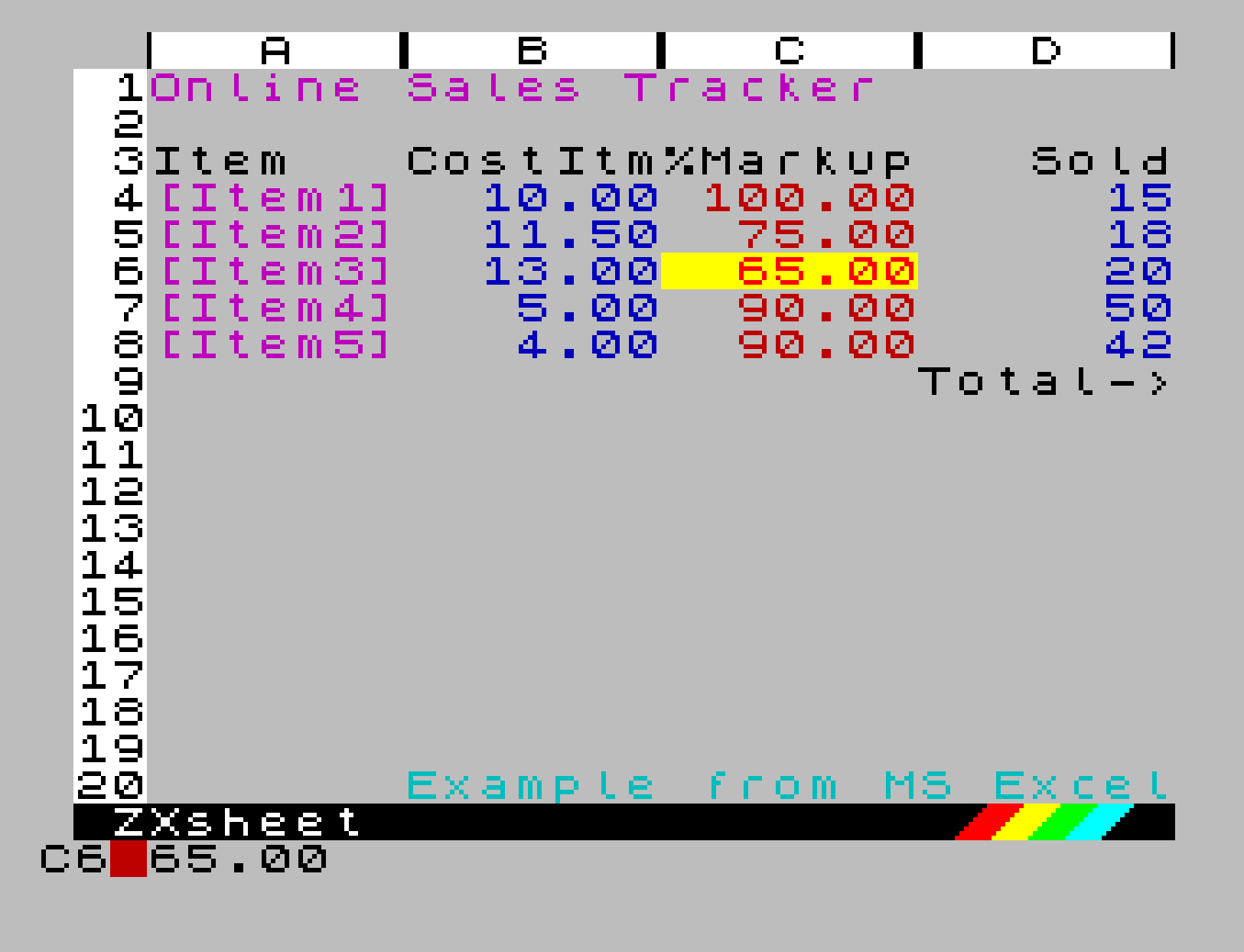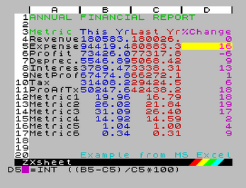 ZXsheet is a full-featured spreadsheet application for the Sinclair ZX Spectrum written in just 10 lines of BASIC. It features a large 20 rows by 10 column workspace, full colour formatting, formula support, copy/paste functions (including relative addressing), the ability to save and print spreadsheets, and a groundbreaking graphical chart function.