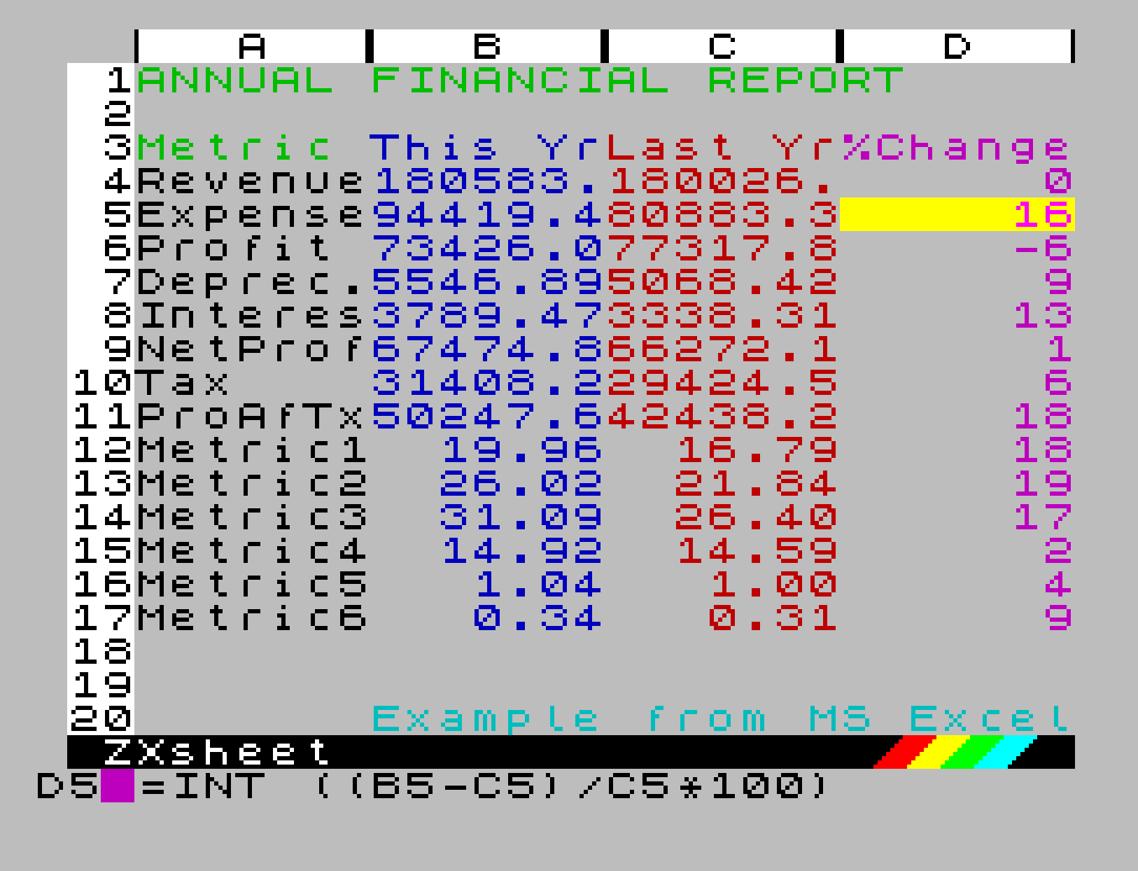I had been very impressed with a previous BASIC 10 liner contest entry in 2021 called "ZXcel/256" by Nick Shcherbyna. He had managed to cram a fully-featured spreadsheet application into a ZX Spectrum BASIC 10 liner. It included formulas and relative addressing via copy/paste. However it wasn't very practical to use day-to-day due to the slow speed of navigating around the sheet and the long recalculation times. At the end of his description, Nick said "It was a one day hobby project, so there is a lot to improve. Left it as an exercise to the reader." So I thought I'd take him up on the exercise. Mine definitely took more than one day!